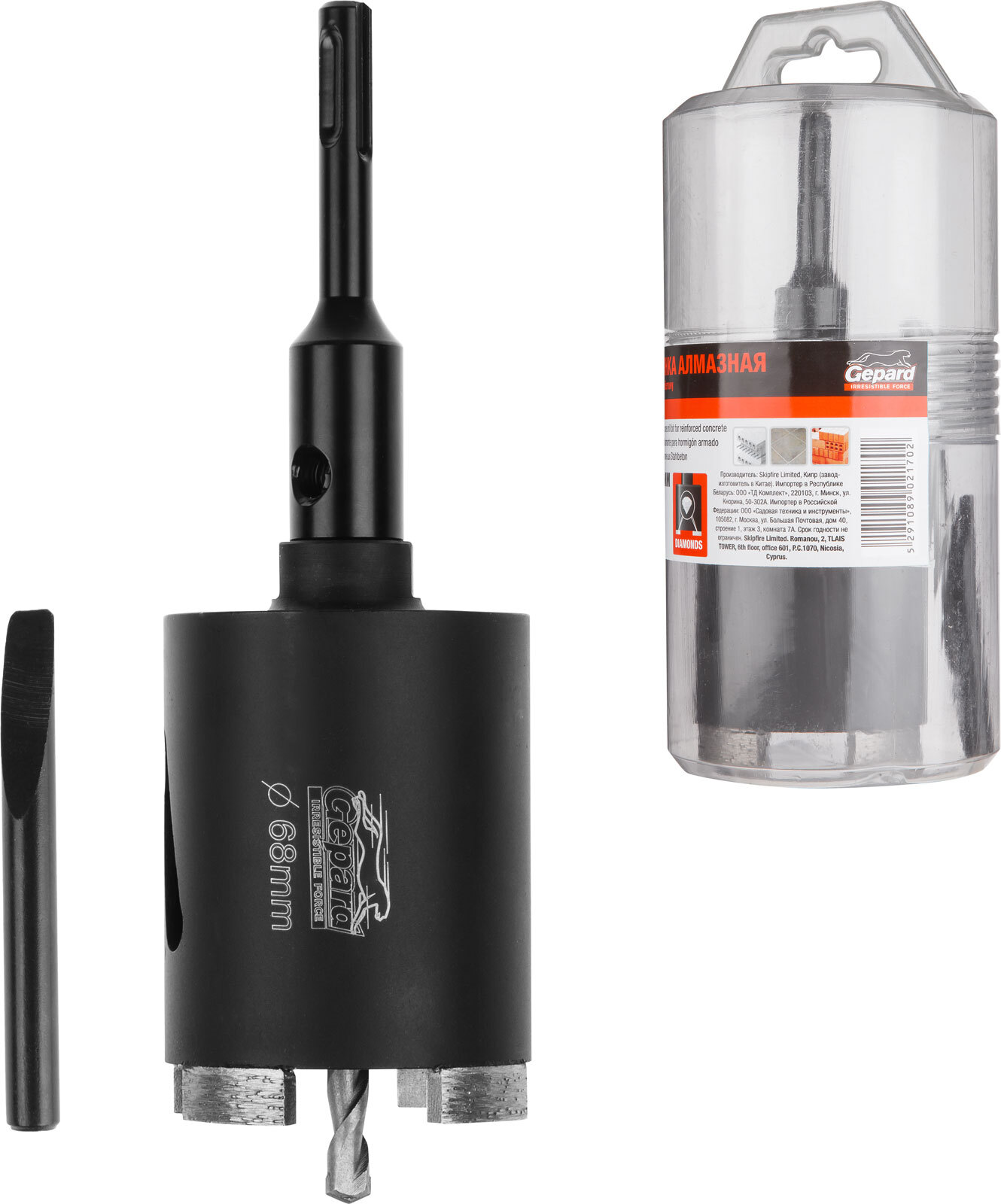Комплект: коронка с алмазными сегментами, направляющее центрирующее сверло по бетону, держатель для коронки с хвостовиком SDS-plus, клин для выбивания центрирующего сверла из державки,