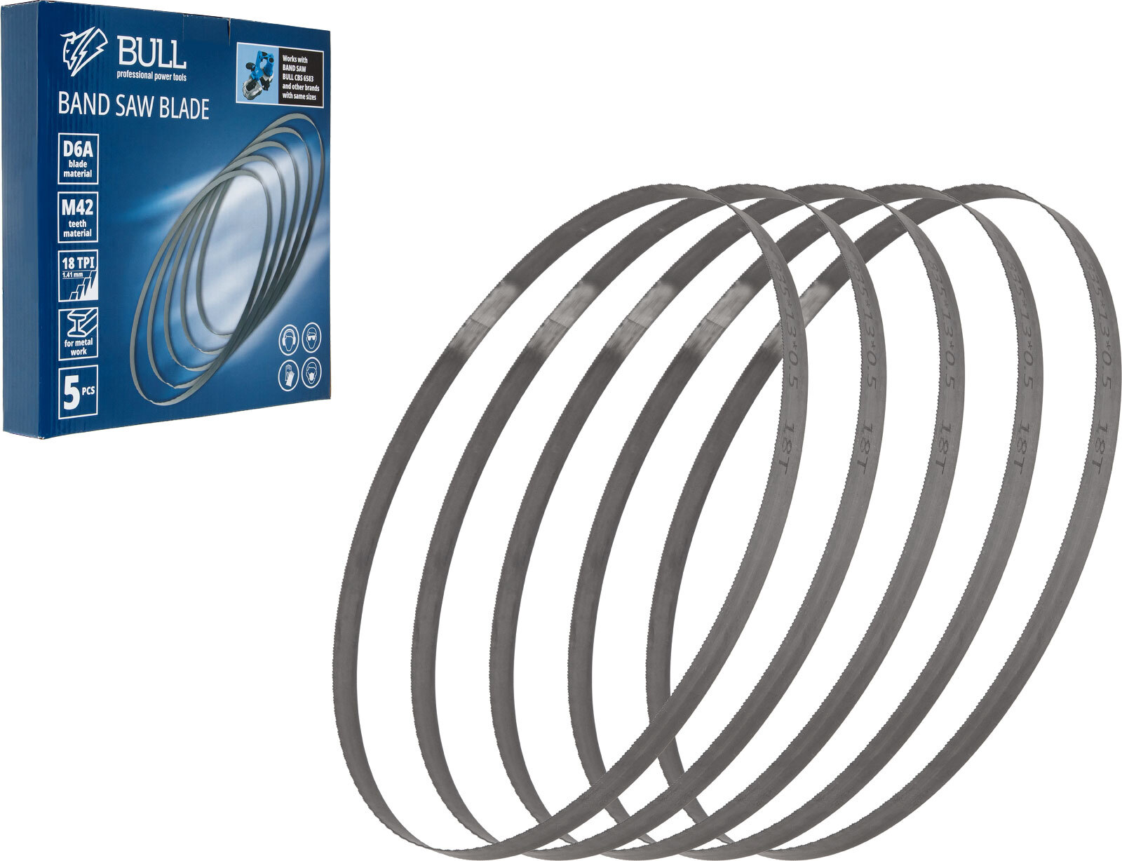 Используется при резке металла, пластика. Используется в работе совместно с моделью ленточной пилы BULL CBS 6583. Материал пильных полотен - легированная сталь D6A. Материал пильных зубьев - быстрорежущая сталь M42, для придания дополнительной твердости. В комплекте 5 шт. пильных полотен.